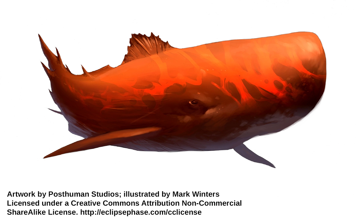 Named for a Hindu sun deity, suryas swim freely in the sun’s corona. Looking roughly like whales or orcas, suryas may reach lengths of ten meters or more. They generate powerful magnetic fields that shield them from solar radiation and heat, while allowing them to surf the solar wind and extract ionized particles. Strong bones and connective tissues protect against the crushing solar gravity. Beneath their thick hides are channels of liquid water interleaved with layers of fat which serve to shield the organism from harmful radiation. Engineered medichines repair tissue damaged by radiation and convert hydrogen ions into water.